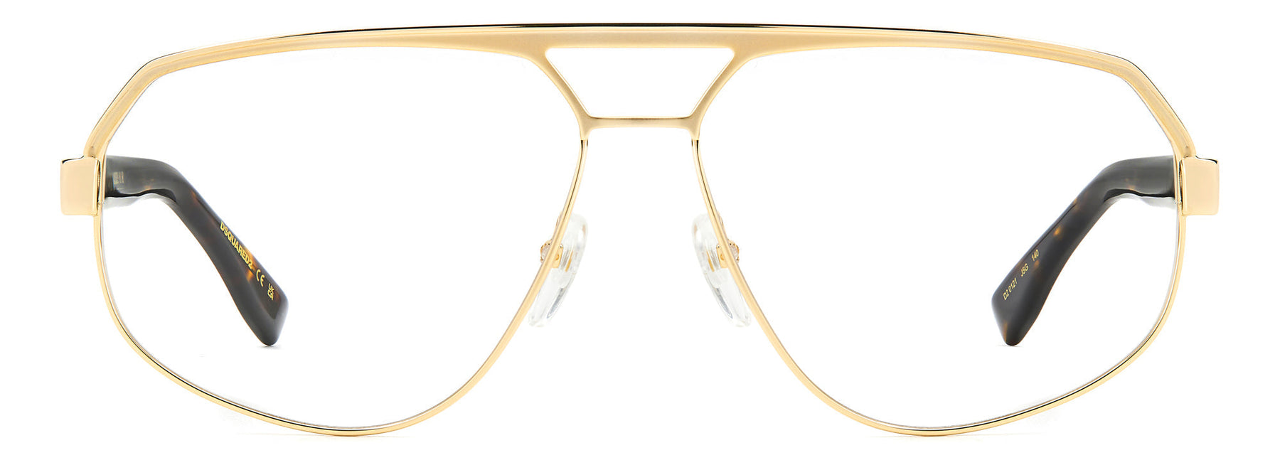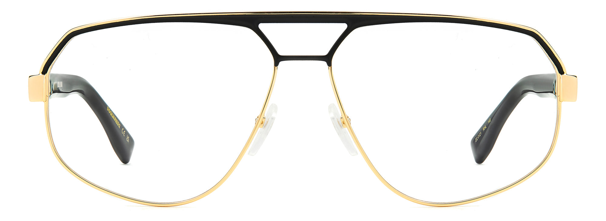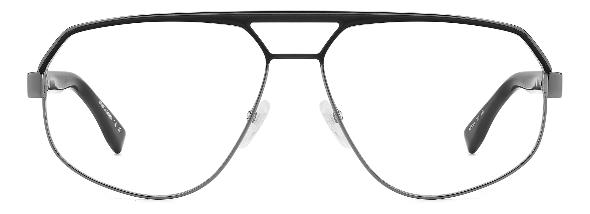 Men's eyeglasses with a daring shape, as only DSQUARED2 can. The aviator frames have been given a modern geometric update, with a metal or enamel-embellished browline to distinguish the double bridge. The temples are in metal and are trimmed by a raised and offset DSQUARED2 logo, completed by long acetate end tips with the iconic maple leaf. Adjustable nose pads and integrated flex hinges are advanced features for a personalised fit.